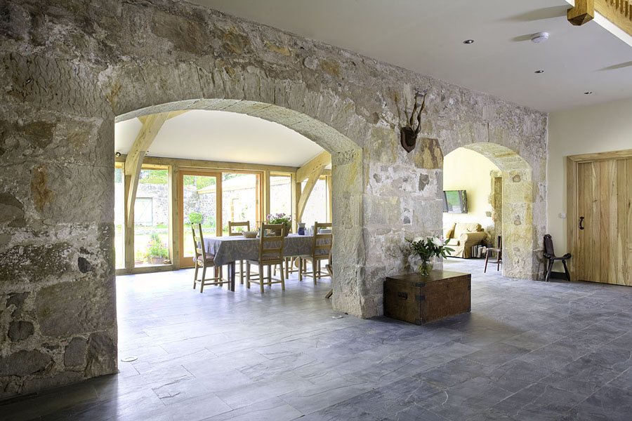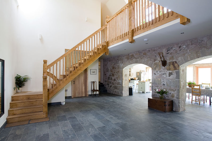 Wagon House is the conversion of an agricultural steading on a private estate in Fife. The house is planned around the existing stone walls that remained intact, and careful consideration was given to conserving as much of the existing walls as possible, without compromising the design. The south facing courtyard provided the perfect situation to exploit direct sunlight and the open plan Kitchen and Living Area open up into this private, sunny space.