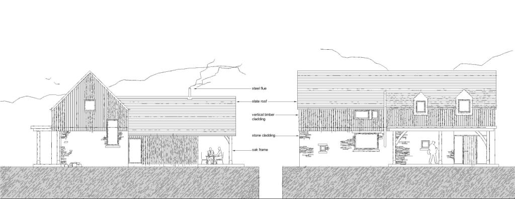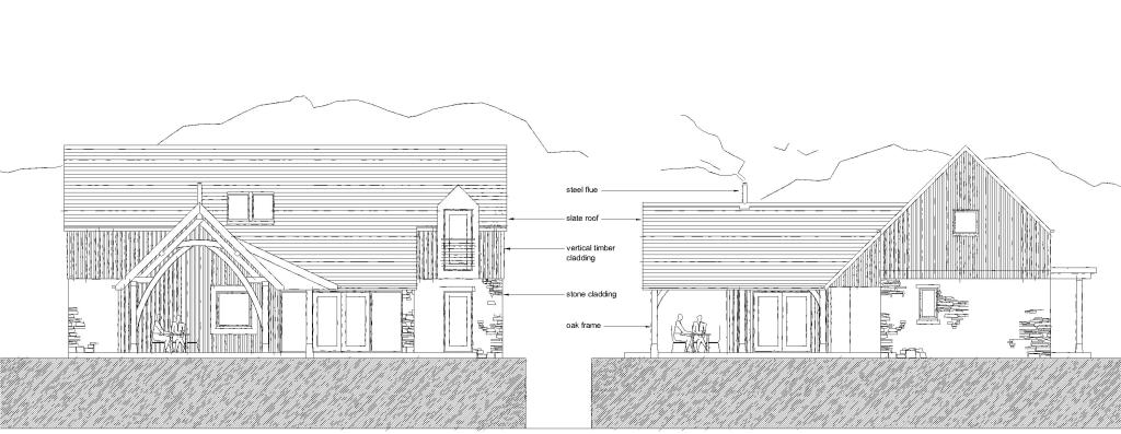 A new house in Stirlingshire on the drawing board. Drawings below show the elevations, which use stone, timber cladding, slate and oak framing to define different parts of the house.