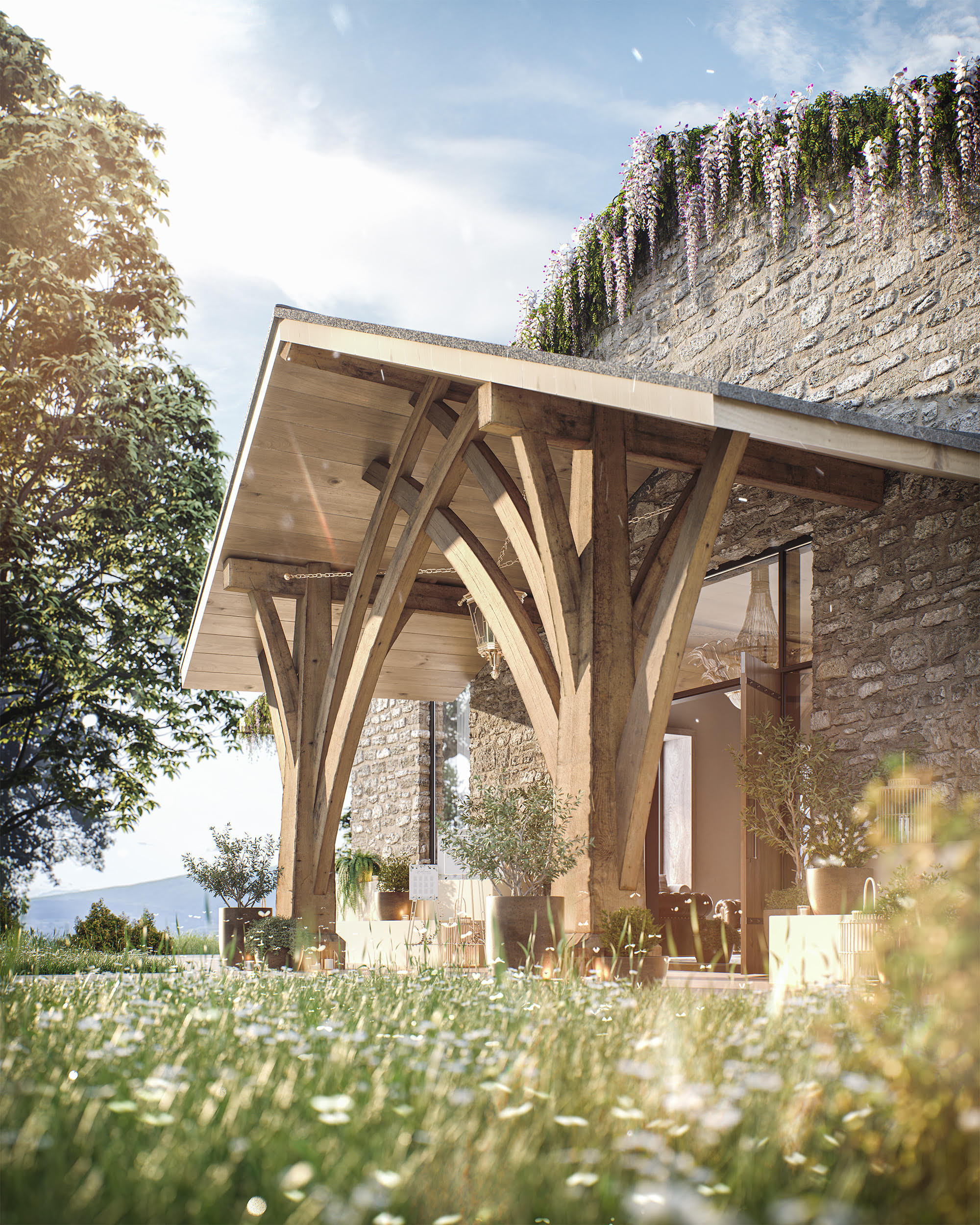 A large new build house in a remote rural area in Fife is proposed on the site of an existing and redundant steading. The house includes a substantial amount of green oak framing and re-use of the existing stone. A quarry on site offers an excellent opportunity to source stone locally, you don't get much closer than that. The areas of glazing are carefully positioned to make the most of the scenic views and direct sun light during the day.