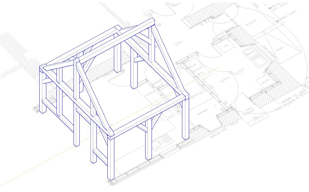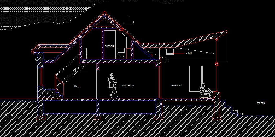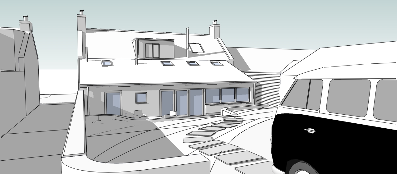 Detailed design for an extension with an unusual roof is progressing after receiving planning permission. The angular roof allows daylight to penetrate deeper in to the house.