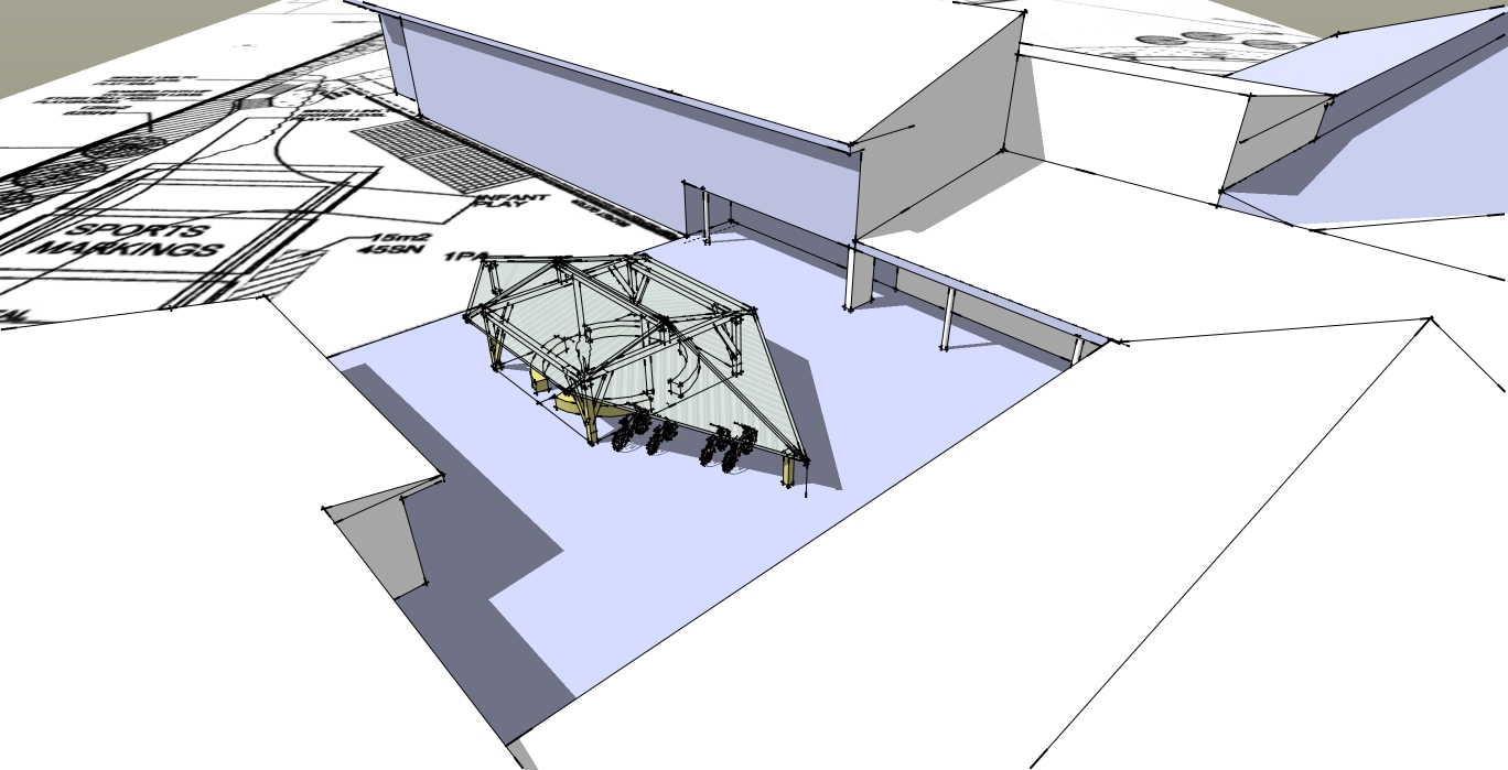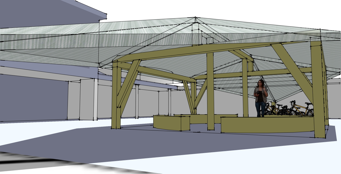 A new multi-purpose outdoor space at Inzievar Primary School in Oakley, Fife, The structure provides shelter for outdoor teaching and other activities. Supported on a green timber structure, the translucent roof allows ample daylight in to the space below.